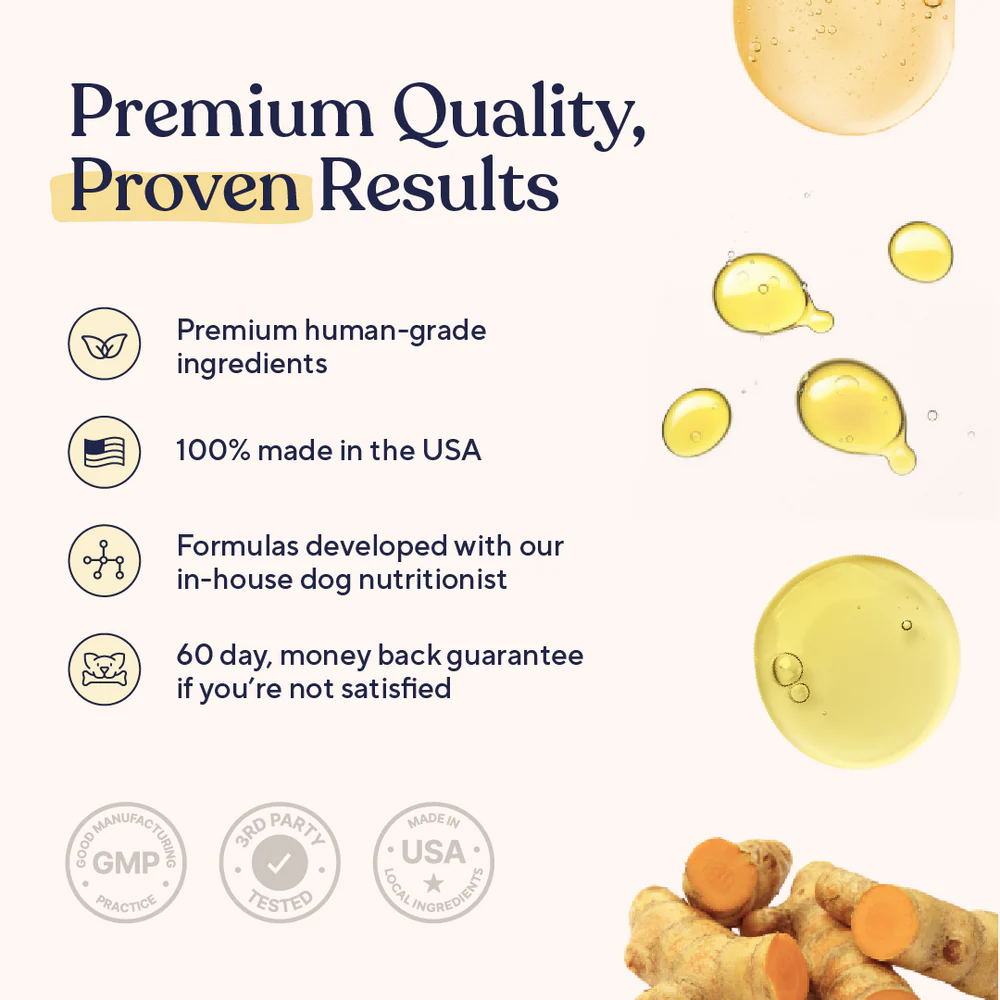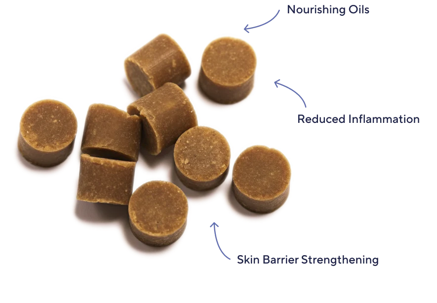Our chews offer a blend of anti-inflammatory oils and nutrients that can help restore your dog’s skin and coat to its natural strength and shine by soothing irritated skin and managing inflammation. Turmeric also provides anti-inflammatory benefits, supporting relief from itching and discomfort caused by irritants.
